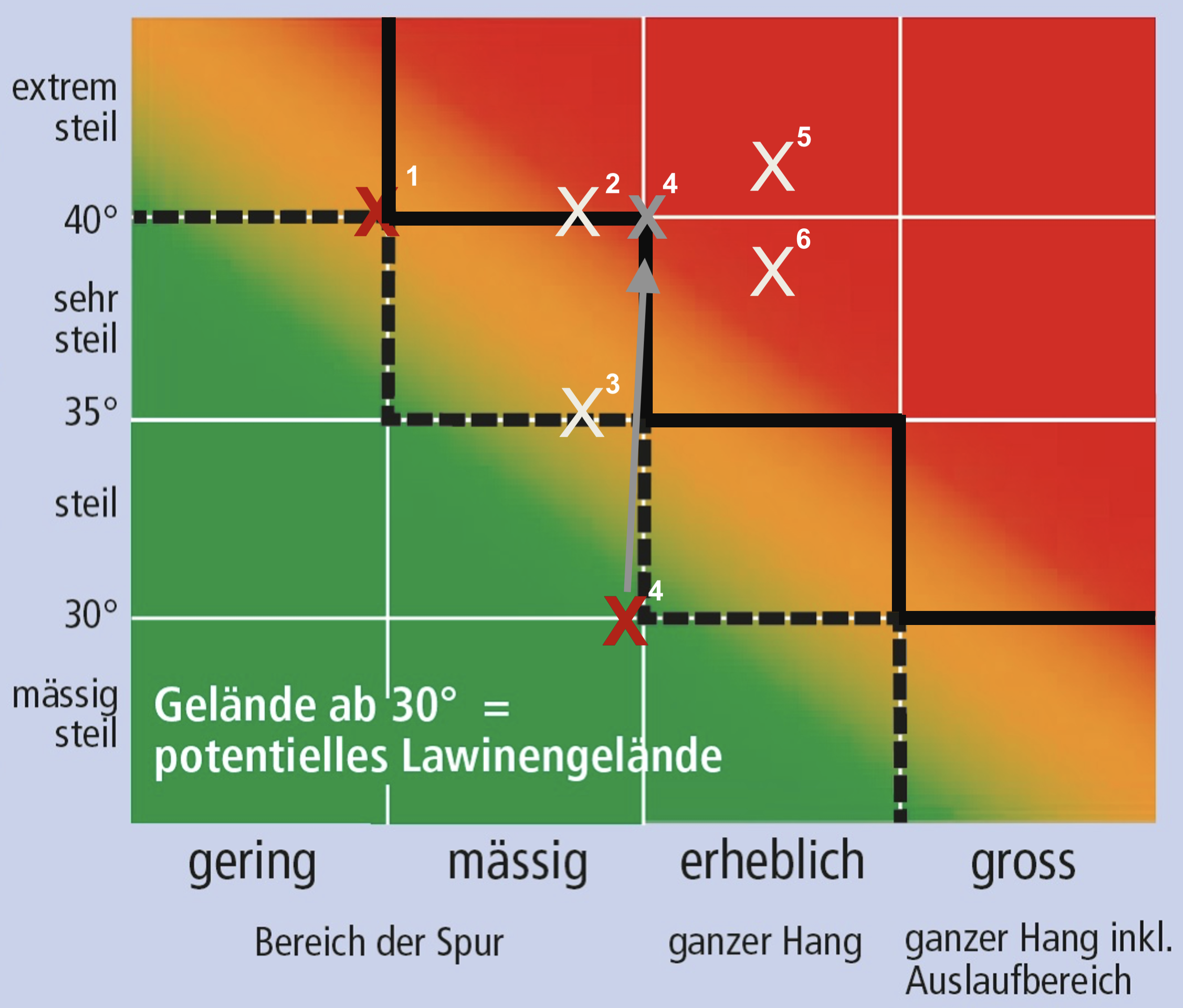 Der Unfallhang lag jedoch nahe einer Regionsgrenze der Lawinenwarnung. In der angrenzenden Nachbarregion herrschte zum Unfallzeitpunkt Lawinenwarnstufe 3. Bei dieser Warnstufe ist für die korrekte Anwendung der Grafischen Reduktionsmethode die steilste Hangpartie maßgeblich. Diese betrug im Bereich des Unfallhanges rund 40°. Wird der gesamte Hang unter diesen Voraussetzungen beurteilt, ergibt sich auch für diese Tour ein deutlich erhöhtes bis hohes Risiko (graues X4).