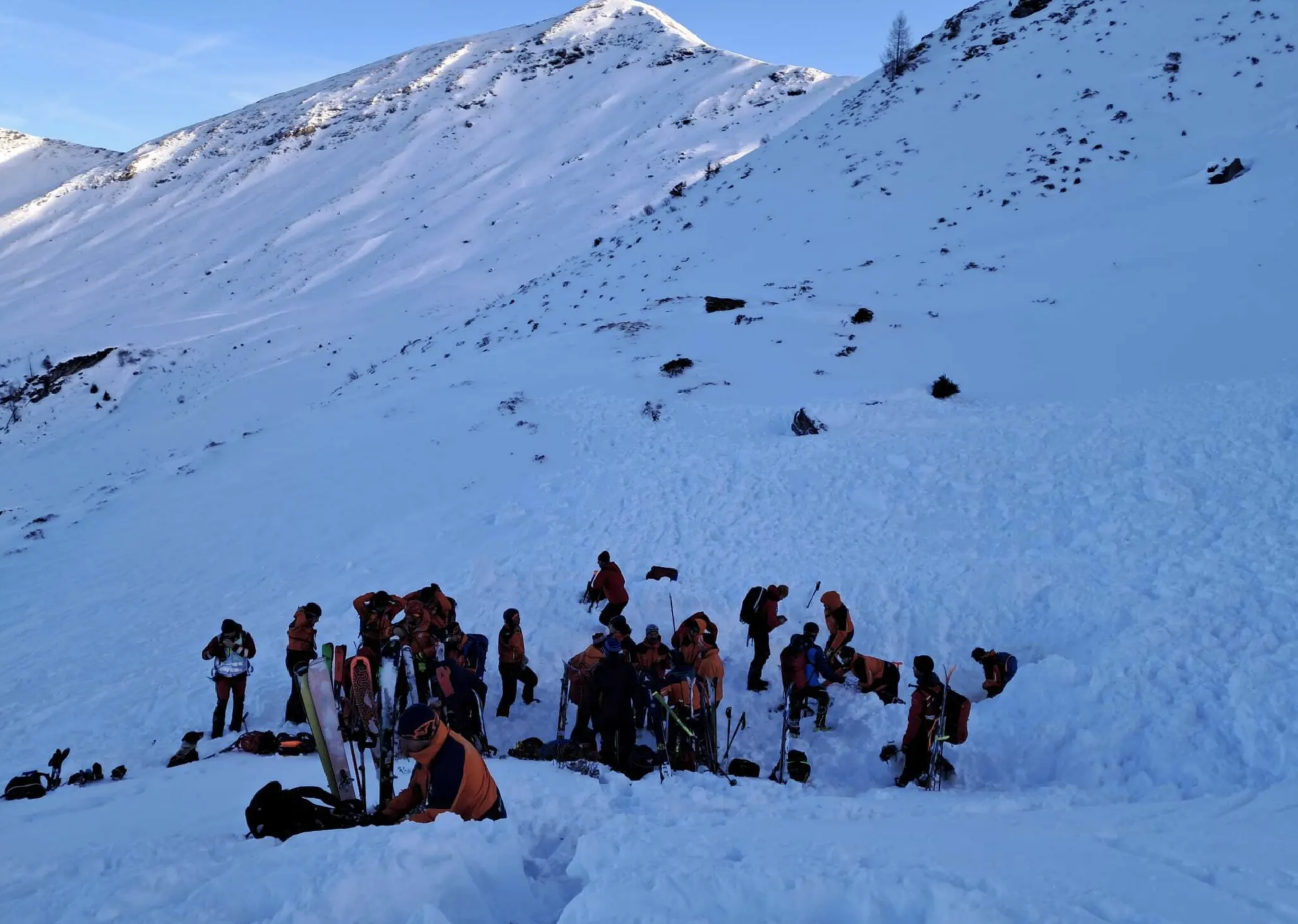 Hinweis: Derzeit ist nicht bekannt, ob innerhalb der Gruppe Sicherheitsabstände eingehalten wurden; dies ist Gegenstand der laufenden Ermittlungen. Fest steht jedoch, dass die Anordnung der Personen im Hang nicht ausreichte, um eine Verschüttung der gesamten Gruppe durch die bis zu 100 m breite Lawine zu verhindern.
